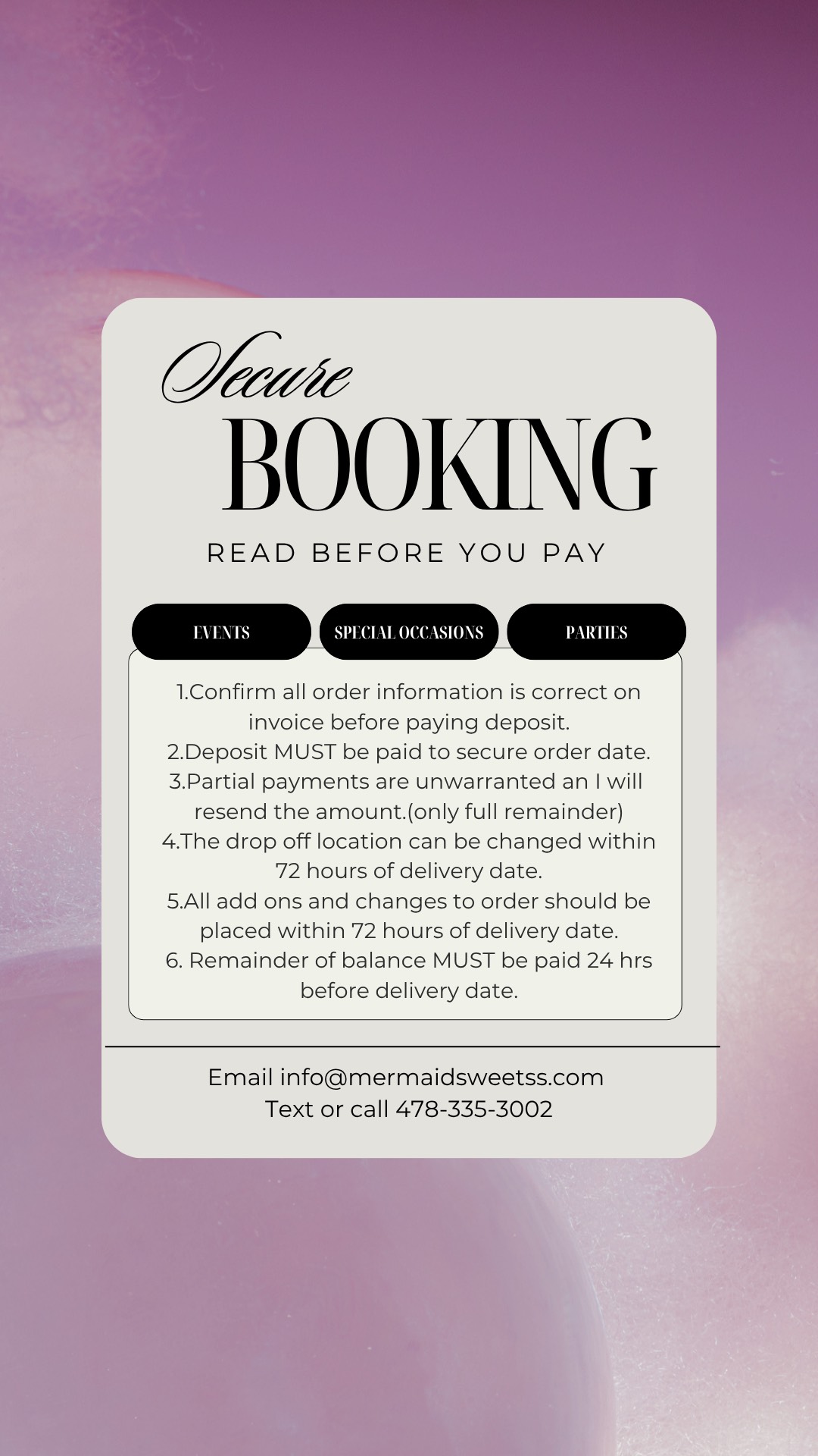 | Specialty - $75 and up | Strawberry Crunch, Sweet Potato, Cookies & Cream, Red Velvet |